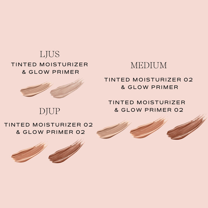 Våra produkter är gjorda för att mixas och matchas! Från ljus till djup hudton kan du kombinera Glow Primer 01 & 02 och Tinted Moisturizer 01 & 02 med varandra. Följ riktlinjerna på bilderna.